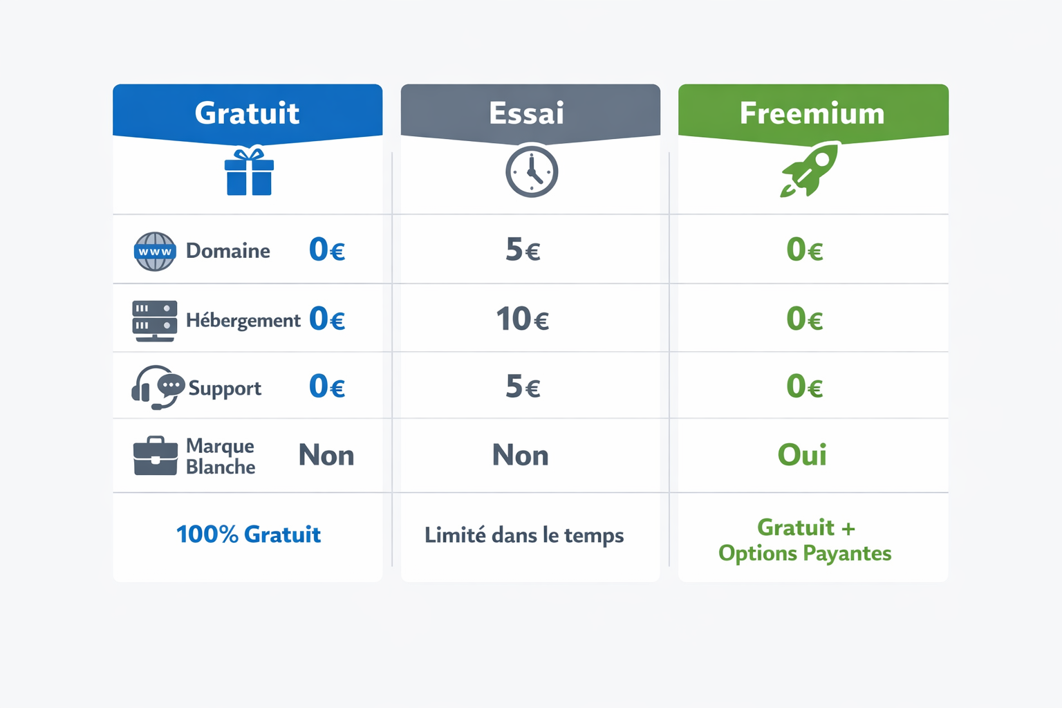 Gratuit à vie marche parfois pour un site perso, un prototype, ou une landing page interne. Mais dès que vous êtes en marque blanche, les contraintes changent.